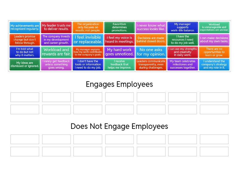 Engages Employees: My manager explains how my work contributes to the company’s goals., I have the resources I need to do my job well., My achievements are recognized regularly., I receive feedback that helps me improve., I can make decisions about my own tasks., My leader trusts me to deliver results., The company invests in my development and career growth., I feel my voice is heard in meetings., I understand the company’s strategy and my role in it., My team celebrates milestones and successes together., Workload and rewards are fair., My manager supports work–life balance., I can use my strengths and creativity in daily work., Leaders communicate transparently, even during challenges., Does Not Engage Employees: I rarely get feedback unless something goes wrong., My ideas are dismissed or ignored., I don’t have the tools or information I need to do my job., I never know what success looks like., Decisions are made behind closed doors., Leaders promise change but don’t follow through., My hard work goes unnoticed., I feel invisible or replaceable., There are no opportunities to learn or grow., Workload is unmanageable and expectations are unclear., Favoritism determines promotions., No one asks for my opinion., I’m told what to do but not why it matters., The organization only focuses on results, not people.,