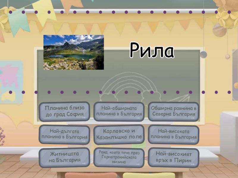 Най-високата планина в България - Рила, Обширна равнина в Северна България - Дунавска равнина, Най-обширната планина в България - Родопи, Река, която тече през Горнотракийската низина - Марица, Карловско и Казанлъшко поле - Розовата долина, Най-дългата планина в България - Стара планина, Планина близо до град София - Витоша, Най-високият връх в Пирин - Вихрен, Житницата на България - Добруджа,