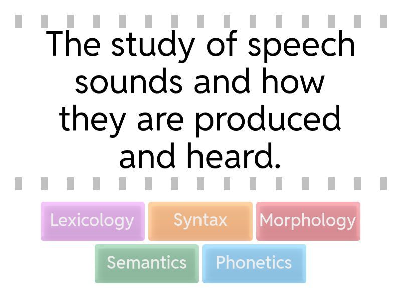 Phonetics - The study of speech sounds and how they are produced and heard., Morphology - The study of the structure and form of words., Syntax - The set of rules that govern how words combine to form sentences., Semantics - The study of meaning in language., Lexicology - The study of words, their nature, and meaning.,