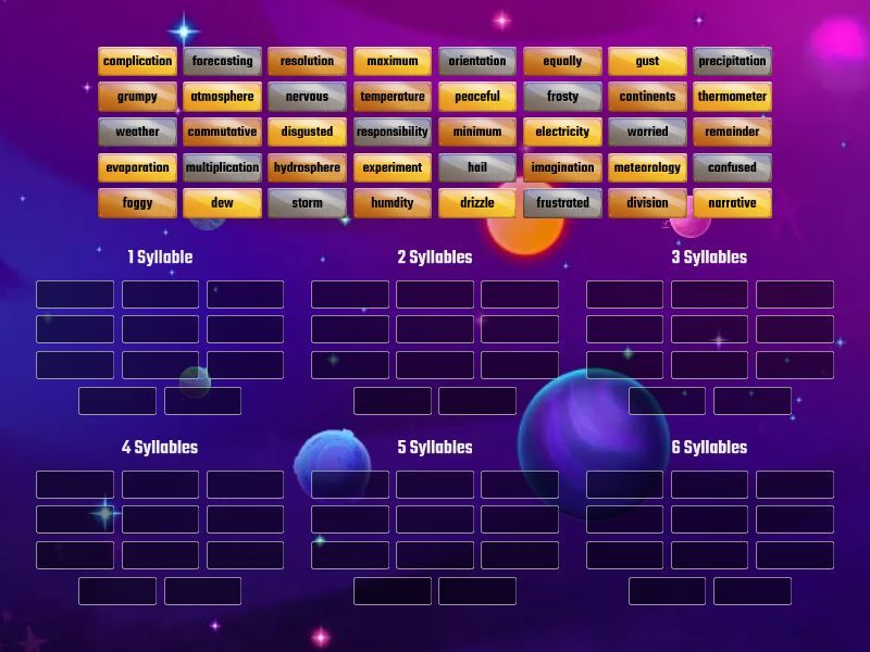 1 Syllable: storm, gust, dew, hail, 2 Syllables: weather, frosty, foggy, drizzle, nervous, grumpy, worried, disgusted, confused, peaceful, 3 Syllables: hydrosphere, continents, maximum, minimum, remainder, division, equally, frustrated, narrative, forecasting, atmosphere, 4 Syllables: temperature, humdity, complication, resolution, commutative, experiment, precipitation, thermometer, 5 Syllables: multiplication, electricity, imagination, orientation, evaporation, 6 Syllables: responsibility, meteorology,