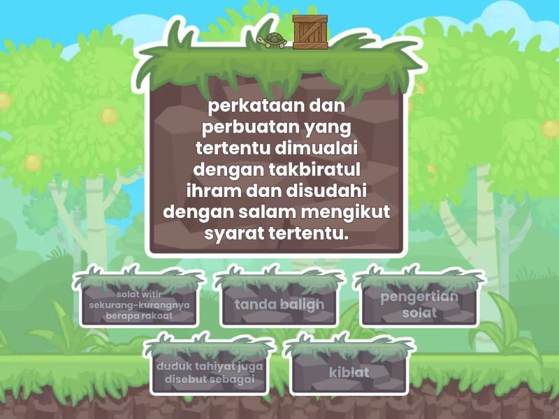 pengertian solat - perkataan dan perbuatan yang tertentu dimualai dengan takbiratul ihram dan disudahi dengan salam mengikut syarat tertentu., tanda baligh - keluar air mani bagi lelaki dan keluar haid bagi perempuan., kiblat - arah menghala ke kaabah di masjidil haram di mekah., duduk tahiyat juga disebut sebagai - tasyahud kerana ada bacaan tasyahud, solat witir sekurang-kurangnya berapa rakaat - 3 rakaat dengan dua salam atau dua rakaat dengan satu salam.,