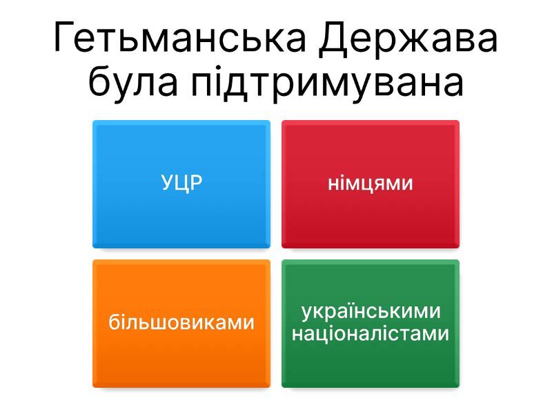 1) Гетьманська Держава була підтримувана a) УЦР b) німцями c) більшовиками d) українськими націоналістами 2) Очолив Гетьманат a) Володимир Винниченко b) Симон Петлюра c) Михайло Грушевський d) Павло Скоропадський 3) Гетьманська Держава Павла Скоропадського була проголошена a) 29 квітня 1918 року b) 4 березня 1917 року c) 25 жовтня 1917 d) 16 липня 1918 року 4) Головою Гетьманського уряду став a) Дмитро Дорошенко b) Симон Петлюра c) Федір Лизогуб d) Павло Скоропадський 5) Уся повнота влади була зосереджена a) у руках народу b) у руках гетьмана c) у руках німців d) у руках австрійців 6) Що було зроблено у внутрішній політиці a) відновлено приватну власність, цензури,скасування 8 годинного робочого дня b) земля перейшла селянам, підприємства-у державу c) все залишилось по- старому d) скасування української мови,традицій 7) Хто був основною соціальною опорою Гетьманату a) поміщики, буржуазія, заможні селяни b) робітники, безземельні селяни c) українська інтелігенція d) українські націоналісти та німецькі військові 8) У якій сфері політика Скоропадського була найуспішнішоюй a) політичній b) економічній c) культурній d) зовнішньополітичній 9) Хто найбільш негативно ставився до Гетьманської Держави a) селяни b) робітники c) буржуазія d) культурні діячі 10) Як називався документ, у якому Гетьман звертався до українців про встановлення своєї влади a) Універсал b) Декларація про мир c) Меморандум d) Грамота до всього українського народу 11) Коли Гетьман П.Скоропадський зрікся влади a) 4 березня 1917 року b) 14 грудня 1918 року c) 13 листопада 1918 року d) 28 листопада 1918 року