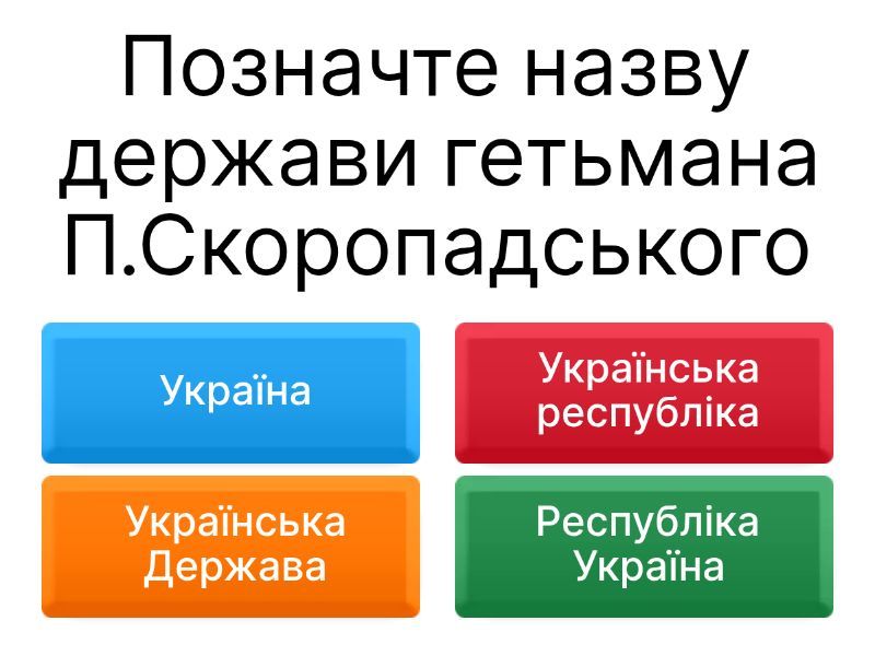 1) Позначте назву держави гетьмана П.Скоропадського a) Україна b) Українська республіка c) Українська Держава d) Республіка Україна 2) Який документ від 29 квітня 1918 р. засвідчив курс внутрішньої політики уряду гетьмана П.Скоропадського? a) "Маніфест до українського народу з ультимативними вимогами до Української Ради" b) "Тимчасовий Основний Закон про державну самостійність українських земель" c) "Статут вищого управління України" d) "Грамота до всього українського народу" 3) Проаналізуйте зображену картосхему. Вона дає змогу визначити територію a) Української Народної Республіки згідно з Третім Універсалом Української Центральної Ради. b) поширення влади Генерального Секретаріату згідно з «Тимчасовою інструкцією...» Тимчасового уряду Росії. c) Української Держави гетьмана Павла Скоропадського. d) Української Соціалістичної Радянської Республіки. 4) З даного переліку осіб вкажіть П.Скоропадського a) b) c) d) 5) Яка ідея була покладена в основу аграрної реформи, яку намагався провести гетьман? a) повернення землі колишнім власникам без обмеження розміру приватного землеволодіння b) створення державного земельного фонду і продаж ділянок малоземельним селянам і козакам c) ліквідація поміщицького землеволодіння і роздача землі селянам 6) Головою Кабінету Міністрів гетьманського уряду було обрано: a) О.Севрюк b) П.Скоропадський c) М.Грушевський d) Ф.Лизогуб 7) Хронологічні рамки існування гетьманату a) 29 квітня 1918-14 грудня 1918р b) 14 квітня 1918-29 грудня 1919р c) 29 квітня 1918-14 грудня 1919 р d) 29 грудня 1917-14 квітня 1918р 8) Коли відбувся гетьманський переворот? a) 29 квітня 1918 b) 29 березня 1918 c) 28 квітня 1918 d) 29 травня 1918 9) «…Українська держава стояла коло краю загибелі. Спаслася вона, дякуючи могутньому підтриманню Центральних держав, які, вірні своєму слову, продовжують і по сей час боротись за цільність і спокій України… Як вірний син України я вирішив взяти на себе тимчасово всю повноту влади» a) звернення «До населення всієї соборної України» С. Петлюри b) «Грамота до всього українського народу» П.Скоропадського c) наказ №1 по Революційній повстанській армії Н.Махна d) відозва «К населению Малороссии» А.Денікіна