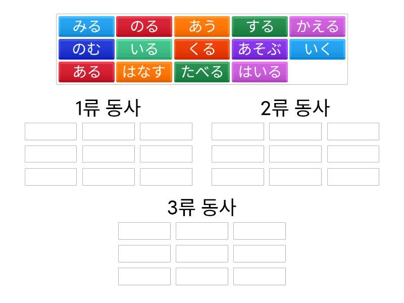 1류 동사: いく, あう, あそぶ, ある, のる, かえる, はいる, はなす, のむ, 2류 동사: たべる, みる, いる, 3류 동사: する, くる,