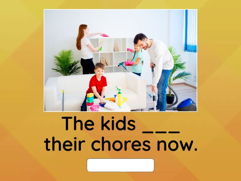 The kids ___ their chores now., No, they ___ computer games. , No, Emma ___ decorations for the school fair., She ___ the clean clothes at the moment.., Look, the parents ___ a cup of coffee., No, they ___ TV now., No, Poppy and her friend ___ the house today., They ___ the shopping..