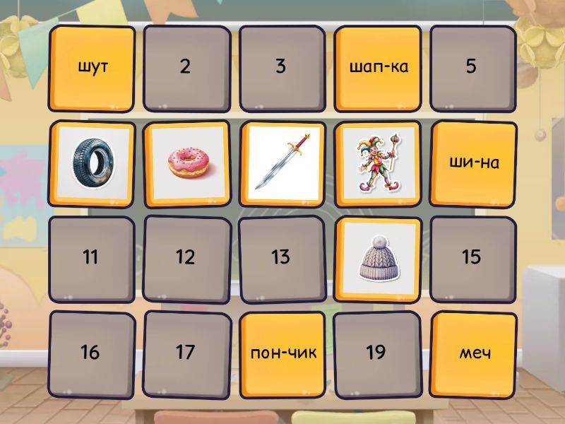 шап-ка, ши-на, шут, пон-чик, меч, чаш-ка, а-на-нас, ком-пас, ко-ле-со, нос,