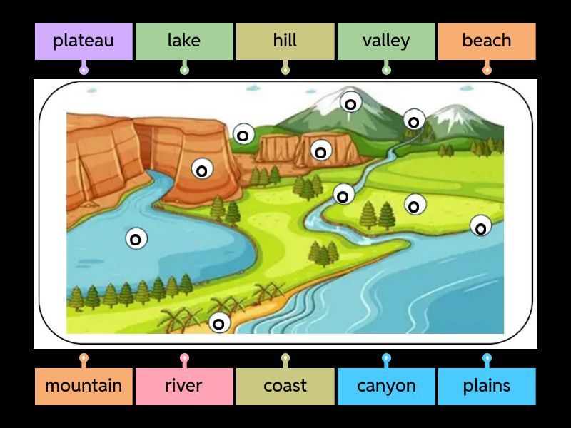 beach, lake, canyon, hill, river, plateau, mountain, valley, plains, coast.
