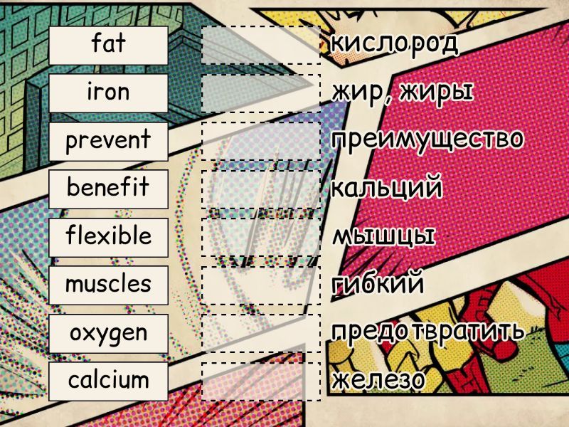 nutrient - питательное вещество, supply - запас, питать, доставлять, dairy - молочные продукты, wholegrain - цельнозерновой, provide with - обеспечивать, давать, heal - лечить, cell - клетка, frozen - замороженный, dried - засушенный, fat - жир, жиры, protein - белок, carbohydrats - углеводы, iron - железо, oxygen - кислород, prevent - предотвратить, poultry - домашняя птица, (un) balanced - не (сбалансированный), follow a diet - следовать диете, benefit - преимущество, flexible - гибкий, calcium - кальций, muscles - мышцы, consist of - состояить из,