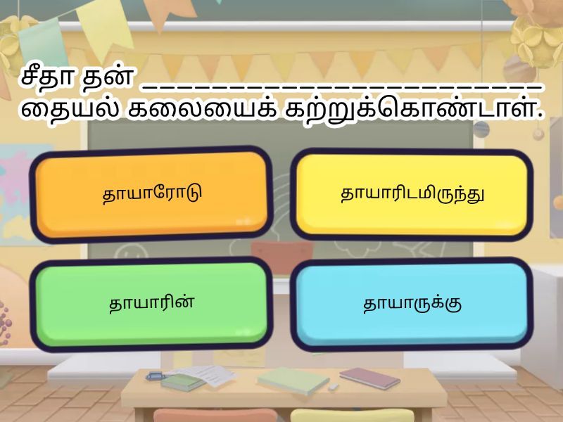 1) சீதா தன் _______________________ தையல் கலையைக் கற்றுக்கொண்டாள். a) தாயாரோடு b) தாயாரிடமிருந்து c) தாயாரின் d) தாயாருக்கு 2) விற்பனையாளர் எடுத்துக் காட்டிய ____________________ மாலதி தனக்குப் பிடித்ததை வாங்கினாள். a) சேலைகளை b) சேலைகளுடன் c) சேலைகளுக்கு d) சேலைகளிலிருந்து 3) தொழிற்சங்கம் _________________ திரட்டிய கருத்துகளின் அடிப்படையில் சில திட்டங்களை வகுத்தது.. a) ஊழியர்களிடமிருந்து b) ஊழியர்களின் c) ஊழியர்களுக்கு d) ஊழியர்களால் 4) _________________ பெறப்படும் எல்லாத் தகவல்களும் உண்மையானவை என நம்பிவிடக்கூடாது. a) இணையத்தால் b) இணையத்தின் c) இணையத்துக்கு d) இணையத்திலிருந்து 5) என் _________________ கிழக்குத் திசையில் ஒரு பெரிய பேரங்காடி உள்ளது a) அலுவலகத்தின் b) அலுவலகத்தால் c) அலுவலகத்திலிருந்து d) அலுவலகத்துடன்