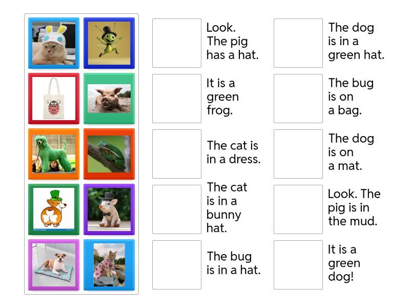 The dog is in a green hat., The cat is in a bunny hat., Look. The pig is in the mud., Look. The pig has a hat., The dog is on a mat. , The cat is in a dress., It is a green frog. , It is a green dog!, The bug is in a hat., The bug is on a bag.,