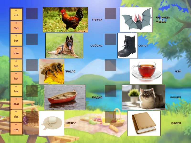 bee - пчела, book - книга, boot - сапог, hat - шляпа, boat - лодка, tea - чай, bat - летучая мышь, cat - кошка, dog - собака, cock - петух,