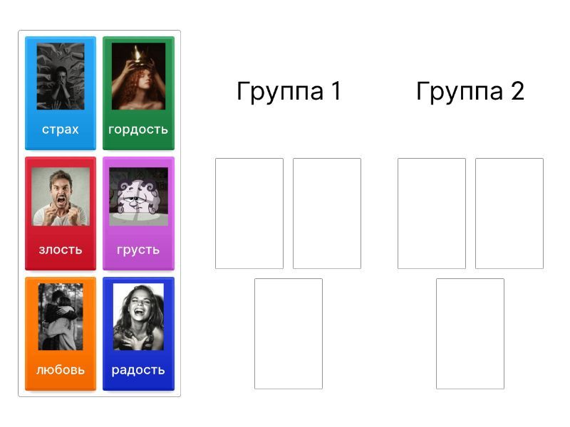 Группа 1: радость, любовь, гордость, Группа 2: злость, страх, грусть,