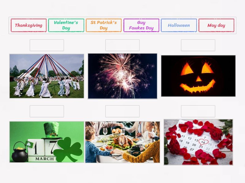 St Patrick's Day,  Thanksgiving, Guy Fawkes Day, Halloween, Valentine's Day, May day,