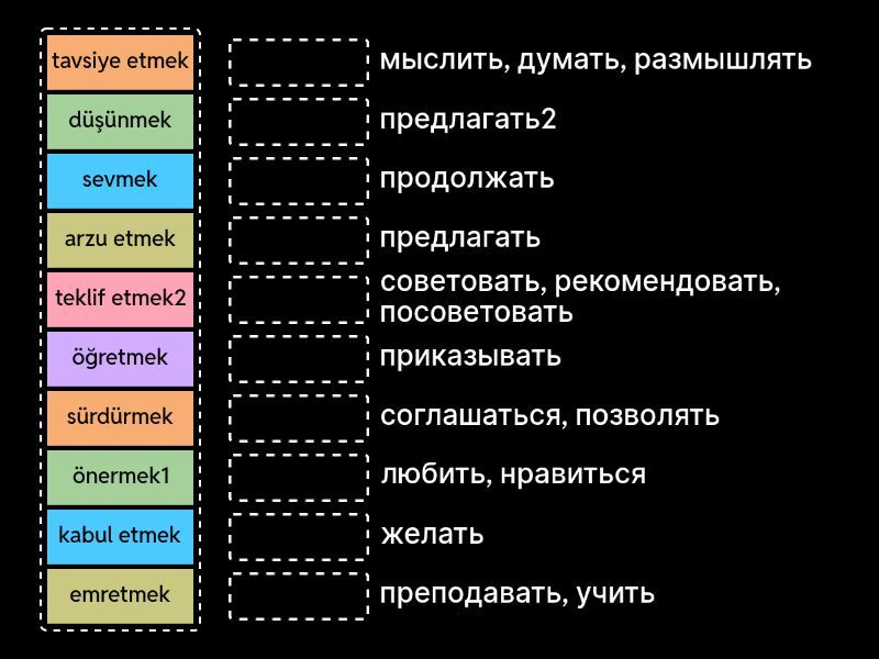 söylemek - говорить, beklemek - ждать, ожидать, arzu etmek - желать, unutmak - забывать, bitirmek - заканчивать, yasaklamak - запрещать, bilmek - уметь, öğrenmek - изучать, sevmek - любить, нравиться, hayal etmek - мечтать, düşünmek - мыслить, думать, размышлять, beğenmek - нравиться, bırakmak - оставлять, бросать, reddetmek - отказывать, planlamak - планировать, teklif etmek2 - предлагать2, önermek1 - предлагать, tercih etmek - предпочитать, öğretmek - преподавать, учить, emretmek - приказывать, denemek - пробовать, примерять, sürdürmek - продолжать, rica etmek - просить, dinlemek - слушать, tavsiye etmek - советовать, рекомендовать, посоветовать, kabul etmek - соглашаться, позволять, özlemek - тосковать, скучать, başarmak - успешно выполнять, справляться, (çok) istemek - хотеть (очень),