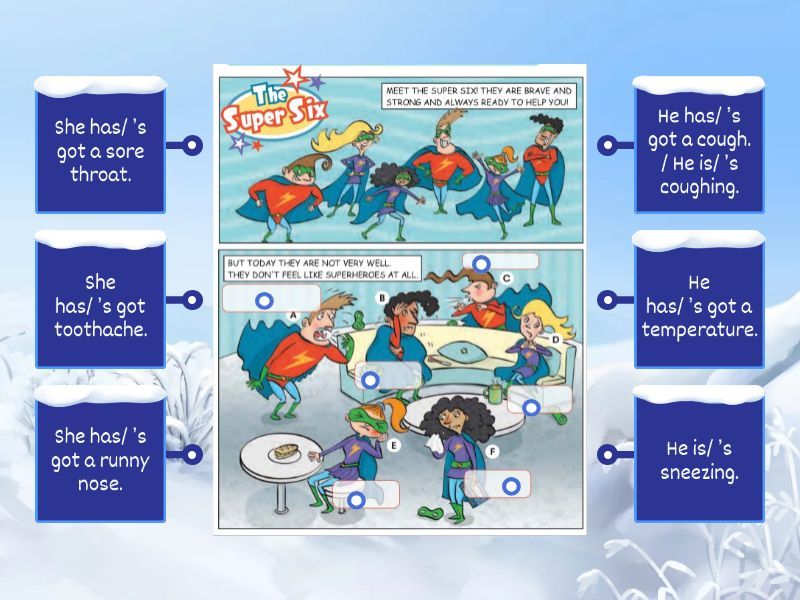 He has/ ’s got a cough. / He is/ ’s coughing., He has/ ’s got a temperature., He is/ ’s sneezing., She has/ ’s got a sore throat., She has/ ’s got toothache., She has/ ’s got a runny nose..