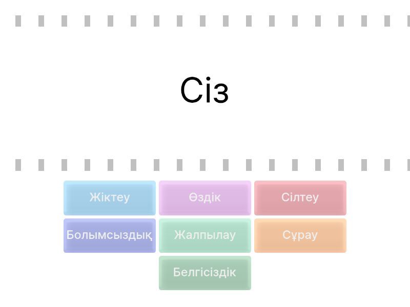 Жіктеу - Сіз, Сілтеу - Анау, Сұрау - Қашан?, Белгісіздік - Біреу, Өздік - Өзім, Болымсыздық - Ешкім, Жалпылау - Барша,