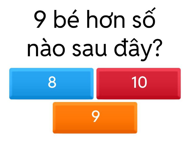 1) 9 bé hơn số nào sau đây? a) 8 b) 10 c) 9 2) Số lớn nhất trong các số: 10; 7; 6; 1 là? a) 10 b) 6 c) 7 3) Kết quả của phép tính: 4 + 4 = ... là? a) 3 b) 5 c) 8 4) Số lớn nhất trong các số: 0; 5; 2; 8 là? a) 5 b) 8 c) 2 5) Điền dấu vào chỗ chấm: 4 + 5 …… 9 a) = b) < c) > 6) Số bé nhất trong các số 5; 1; 3 là? a) 3 b) 5 c) 1 7) 8 lớn hơn số nào sau đây? a) 9 b) 7 c) 8 8) Có bao nhiêu số có một chữ số? a) 10 b) 9 c) 8 9) Các số 5, 2, 8, 4 xếp theo thứ tự từ bé đến lớn? a) 4, 2, 5, 8 b) 2, 5, 4, 8 c) 2, 4, 5, 8 10) Điền dấu vào chỗ chấm: 2 + 5….. 10 – 4 a) = b) < c) > 11) Số lớn nhất trong các số: 3; 7; 5 là? a) 3 b) 7 c) 5 12) Kết quả của phép tính: 6 - 2 = ... là? a) 5 b) 4 c) 3 13) Số bé nhất trong các số 9; 4; 6 là? a) 9 b) 4 c) 6 14) Điền dấu vào chỗ chấm: 7 + 1 …… 8 a) = b) < c) > 15) Số lớn nhất trong các số: 2; 8; 4 là? a) 2 b) 4 c) 8 16) Kết quả của phép tính: 5 + 3 = ... là? a) 7 b) 9 c) 8 17) Số bé nhất trong các số 8; 3; 7 là? a) 8 b) 7 c) 3 18) Điền dấu vào chỗ chấm: 3 + 6 …… 9 a) < b) = c) > 19) Số lớn nhất trong các số: 1; 5; 9 là? a) 9 b) 5 c) 1 20) Kết quả của phép tính: 7 - 3 = ... là? a) 5 b) 4 c) 3 21) phép tính phù hợp với tranh là : a) 3 + 2 = 5 b) 5 - 2 = 3 c) 3 + 3 = 6