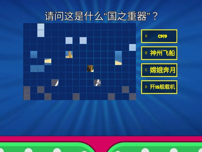 1) 请问这是什么“国之重器”? a) C919大飞机 b) 神州飞船 c) 神州飞机 d) 歼15舰载机 2) 请问这是什么“国之重器”? a) 辽宁舰 b) 山东舰 c) 福建舰 d) 广东舰 3) 请问这是什么“国之重器”? a) 鲨鱼 b) 大型游艇 c) 双航母战斗群 d) 张铭彬的玩具 4) 请问这是什么“国之重器”? a) 东风5C液体洲际核导弹 b) 是光是电是神话 c) 东风—51 d) 洒水车