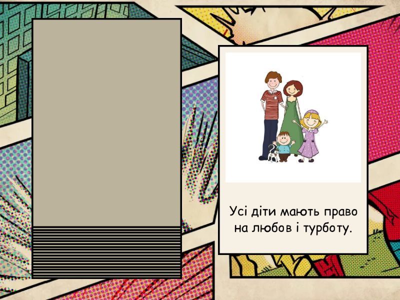 Усі діти мають право на любов і турботу., Кожна дитина має право їсти тільки чипси й хот-доги., Усі діти мають право на ім'я., Усі діти мають право на відпочинок., Кожна дитина має право їсти руками., Жодну дитину не можна скривдити., Кожна дитина може брати чужі речі без дозволу., Діти мають право висловлювати свої думки з важливих для них питань., Будь-яка дитина має право на вживання грубих слів., Діти можуть обирати релігію, мати власні думки та точку зору, однак це не може заважати іншим людям користуватися їхніми правами., Усі діти мають право обирати: ходити їм до школи чи ні., Діти мають право бути захищеними від виконання роботи, що є небезпечною., Діти не повинні знати своїх прав., Усі діти мають право на освіту., Кожна дитина має право на життя., Усі діти мають право не слухати своїх батьків., Кожна дитина має право жити із батьками. Їх не можна розлучати., Діти мають прво на захист від війни та викрадення., Кожна дитина може виїжджати за кордон без батьків., Діти можуть створювати організації, якщо це не шкодить іншим..