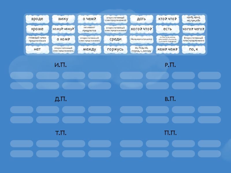 И.П.: не имеет предлогов, кто? что?, есть, главный член предложения, Р.П.: кого? чего?, от, без, у, до, возле, для, вокруг, из, около, с, из-за, из-под,вроде, вроде, среди, между, кроме, нет, второстепенный член предложения., Д.П.: кому? чему?, по, к, дать, второстепенный член предложения.., В.П.: Второстепенный член предложения, На,за,через,про,в,под, кого? что?, вижу, Т.П.: кем? чем?, за, под, на, перед, с, между, второстепенный член предложения!, горжусь, П.П.: о(об), в(во), на,при,обо, о ком?, о чем?, второстепенный член предложения!!,