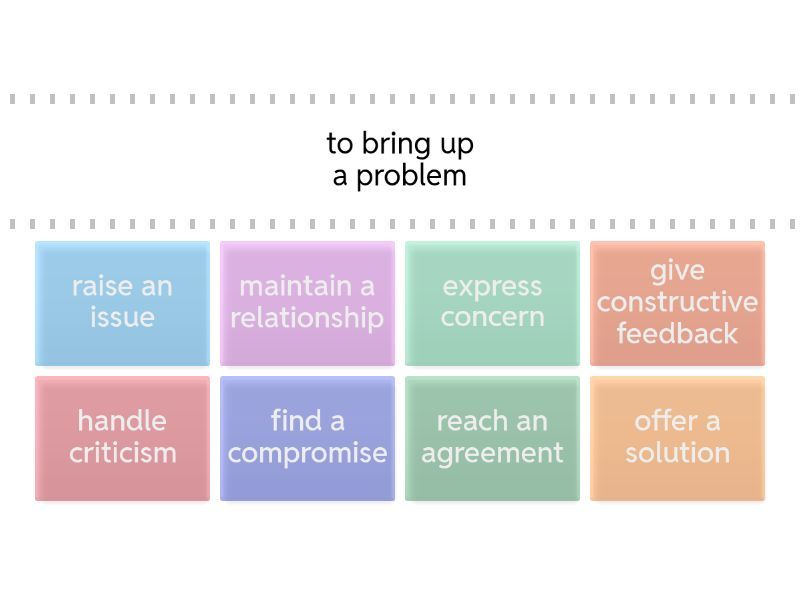 raise an issue - to bring up a problem, handle criticism - to respond to negative comments, offer a solution - to propose how to fix something, reach an agreement - to come to a shared decision, maintain a relationship - keep a positive connection, find a compromise - agree on a middle option, express concern - politely show worry, give constructive feedback - provide useful, helpful criticism,