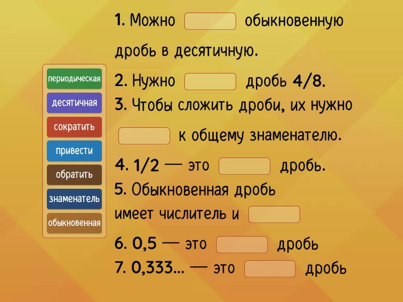 1. Можно ____ обыкновенную дробь в десятичную. 2. Нужно ____ дробь 4/8. 3. Чтобы сложить дроби, их нужно ____ к общему знаменателю. 4. 1/2 — это ____ дробь. 5. Обыкновенная дробь имеет числитель и ____ 6. 0,5 — это ____ дробь 7. 0,333... — это ____ дробь