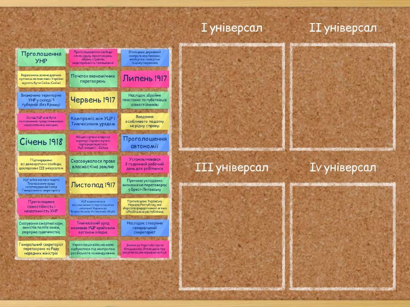 І універсал: Проголошення автономії, Верховним законодавчим органом автономної України мусить бути Сейм (Сойм), Місцеві органи влади на території України мусять підпорядковуватися УЦР, а надалі – Сейму;, Введення особливого податку на рідну справу;, Наслідок: створено генеральний секретаріат, Червень 1917, ІІ універсал: Компроміс між УЦР і Тимчасивим урядом, Липень 1917, Тимчасовий уряд визнавав УЦР крайовим органом влади;, УЦР відмовлялася від самочинного проголошення автономії України до Всеросійських Установчих зборів, Склад УЦР мав бути поповнений представниками національних меншин;, Українізація війська мала відбуватися під контролем російського командування;, УЦР зобов’язалася подати Тимчасовому уряду на затвердження склад Генерального секретаріату, Наслідок: збройне повстання полуботківців (самостійників), ІІІ універсал: Проголошено Українську Народну Республіку, яка зберігала федеративний зв’язок із Російською республікою;, Листопад 1917, Визначено територію УНР у складі 9 губерній (без Криму), Проголошувалися свободи слова, друку, віросповідань, зібрань, страйків, недоторканність помешкання, Скасування смертної кари, амністія політв’язням, реформа судочинства;, Установлювався 8-годинний робочий день для робітників, Скасовувалося право власності на землю, Початок економічних перетворень, Прголошення УНР, ІV універсал: Січень 1918, Проголошено самостійність і незалежність УНР, Підтверджено всі демократичні свободи, декларовані ІІІ уніерсалом, Генеральний секретаріат перетворено на Раду народних міністрів, Оголошено державний контроль над банками, експортом- імпортом та ціноутворенням;, Заклик до боротьби проти більшовиків; Оголошено про реорганізацію народної міліції, Причина укладання: визнання на переговорах у Брест-Литовську,