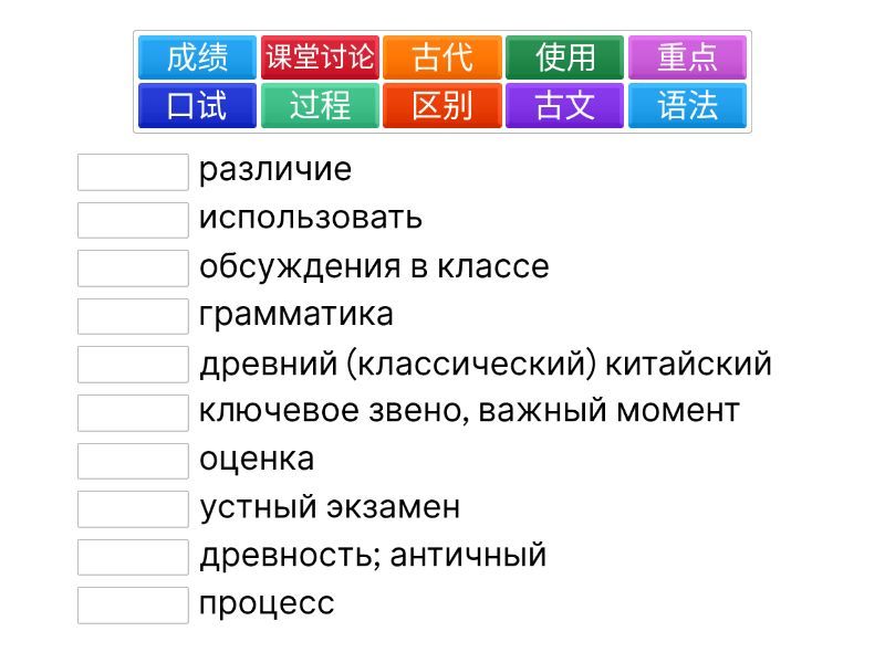 基础 - основание, базис, элементарный; фундаментальный, 知识 - знание, 古代 - древность; античный, 内容 - содержание, 平时表现 - регулярное проявление себя , 语法 - грамматика, 基本 - основной, базовый (который с 本), 期末 - конец семестра, 现代 - современный , 发展 - развитие, развивать , 成绩 - оценка , 区别 - различие , 过程 - процесс, 进行 - проводить (что-либо), 结束 - конец, 重点 - ключевое звено, важный момент, 口试 - устный экзамен, 使用 - использовать, 课堂讨论 - обсуждения в классе, 古文 - древний (классический) китайский,