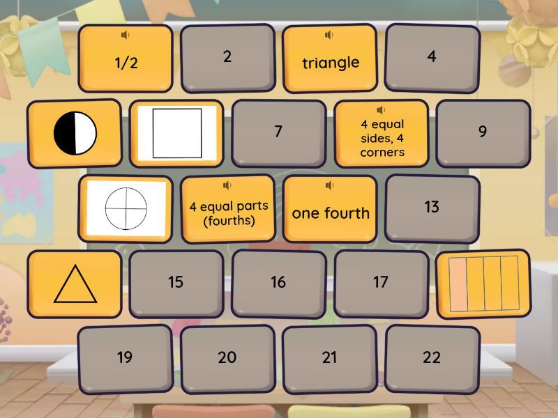 4 equal parts (fourths) , 1/2, triangle, 4 equal sides, 4 corners, one fourth, unequal parts, 4 sides; opposite sides equal, semi-circle, quarter circle, hexagon, quadrilaterals,