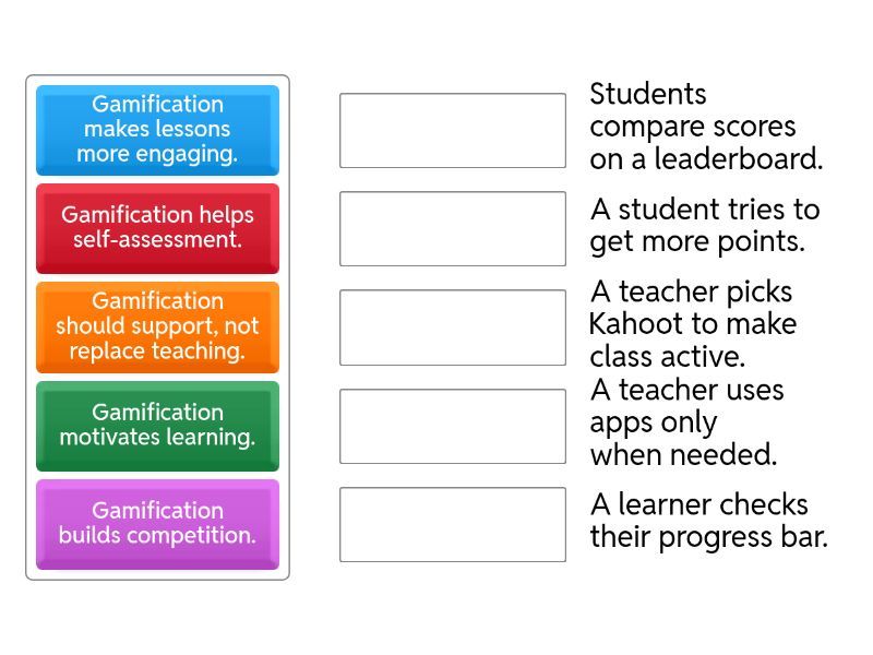 Gamification motivates learning. - A student tries to get more points., Gamification makes lessons more engaging. - A teacher picks Kahoot to make class active., Gamification helps self-assessment. - A learner checks their progress bar., Gamification builds competition. - Students compare scores on a leaderboard., Gamification should support, not replace teaching. - A teacher uses apps only when needed.,