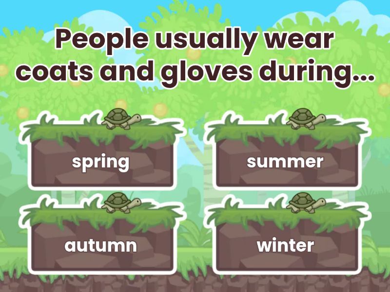 1) People usually wear coats and gloves during... a) spring b) summer c) autumn d) winter 2) The season when leaves turn yellow, red, or brown and begin to fall is a) Summer b) Spring c) Dry d) Fall 3) On a rainy day, people use a ____ a) Sunglasses b) Umbrella c) Cap d) Scraf 4) I am studying English ____ I am not writing now. a) nor b) but c) and d) because 5) We are watching a movie ____ eating popcorn. a) so b) and c) but d) or 6) He is cleaning his room ____ listening to music. a) or b) nor c) but d) and 7) Are you studying now? a) Yes, I am b) Yes, you are c) No, they're not d) No, he is not 8) Are they watching a movie? a) No, she is not b) No, they are not c) Yes, we are d) Yes, they are 9) I want the ____ T-shirt. a) blue b) grey c) purple d) dark blue 10) She is wearing a ____ dress today. a) green b) white c) orange d) yellow 11) We are choosing ____ bags for school. a) pink b) blue c) black d) red 12) What job is this? a) Doctor b) Dentist c) Farmer d) Nurse 13) A ____ serves food and drinks in a café or restaurant. a) waiter b) chef c) cashier d) driver 14) A ____ protects people and keeps the city safe. a) artist b) police officer c) singer d) referee 15) What's his job? a) journalist b) accountant c) security d) postman 16) Today is Friday. What day was yesterday? a) Thursday b) Saturday c) Wednesday d) Monday 17) Today is Tuesday. What day is two days before Tuesday? a) Tuesday b) Sunday c) Monday d) Friday 18) If today is Wednesday, what day is tomorrow? a) Wednesday b) Thursday c) Saturday d) Weekday 19) When do you study English? a) Because I like it b) With my friends c) On Wednesday d) In the classroom 20) Where does Roni work? a) On Monday b) At the hospital c) A doctor d) Because he likes it 21) What does your father do? a) He is a driver b) At 7 a.m. c) In Jakarta d) On Sunday 22) My mother is very _____. She always smiles. a) tall b) happy c) hungry d) late 23) The weather is ____ today. Let’s go outside! a) hungry b) busy c) sunny d) long 24) The singer's job is creative. Change the sentence form! a) A singer has a creative job b) A singer job has creative c) A job as singer is creative d) Creative job is singer 25) My book is colorful. Change the sentence form! a) Our book is colorful b) My colorful book c) I have a colorful book d) Colorful book is us 26) It is hot today, but she ______ a jacket. a) wears b) is wearing c) wearing d) is wear 27) Where does a nurse usually work? a) In hospital b) In office c) On 8 a.m. d) Yesterday 28) “What do you do?” — “_____.” a) I'm at school b) I'm fine, thank you c) I work as a teacher d) I am a studying 29) “Are you wearing your red shoes today?” — “_____, I’m wearing the black ones.” a) Yes, I am b) Yes, I'm not c) No, I'm not d) No, I am 30) She always wears a _____ jacket in winter. a) warm b) warming c) warmly d) warmed