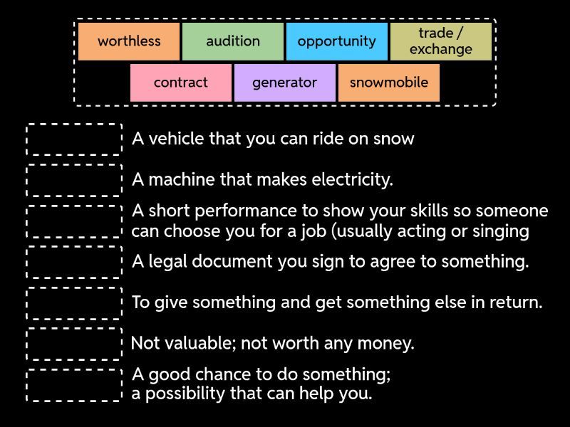 trade / exchange - To give something and get something else in return., worthless - Not valuable; not worth any money., opportunity - A good chance to do something; a possibility that can help you., generator - A machine that makes electricity., snowmobile - A vehicle that you can ride on snow, contract - A legal document you sign to agree to something., audition - A short performance to show your skills so someone can choose you for a job (usually acting or singing,