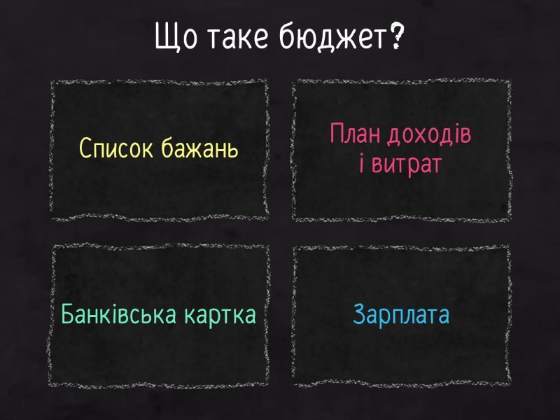 1) Що таке бюджет? a) Список бажань b) План доходів і витрат c) Банківська картка d) Зарплата 2) Чому важливо порівнювати ціни? a) Щоб купити дорожче b) Щоб витратити більше c) Щоб обрати вигіднішу пропозицію d) Щоб уникати магазинів 3) Що означає “фінансова подушка безпеки”? a) Гроші на забаганки b) Накопичення на свята c) Кредитна позика d) Запас коштів на 3–6 місяців 4) Які витрати є обов’язковими? a) Кафе b) Оренда житла та комунальні c) Новий телефон d) Подарунки 5) Що таке кредитна історія? a) Дані про покупки b) Інформація про кредити та платежі людини c) Зберігання паролів d) Номер картки 6) Чому не можна повідомляти CVV-код? a) Бо шахраї можуть вкрасти гроші b) Бо це звичайний номер c) Бо картка заблокується d) Бо він неважливий 7) Як уникнути зайвих витрат у магазині? a) Купувати все, що подобається b) Вести список покупок c) Взяти великий кредит d) Ігнорувати акції 8) Що допомагає контролювати витрати? a) Пам’ять b) Позики c) Азартні ігри d) Бюджетування 9) Що таке фінансова ціль? a) Бажання купити все b) Мрія без плану c) Конкретна сума + термін для її досягнення d) Несподівана покупка 10) Коли варто брати кредит? a) Коли хочеться щось купити без плану b) Коли є можливість не повертати c) Для азартних ігор d) Лише коли є план повернення та реальна потреба