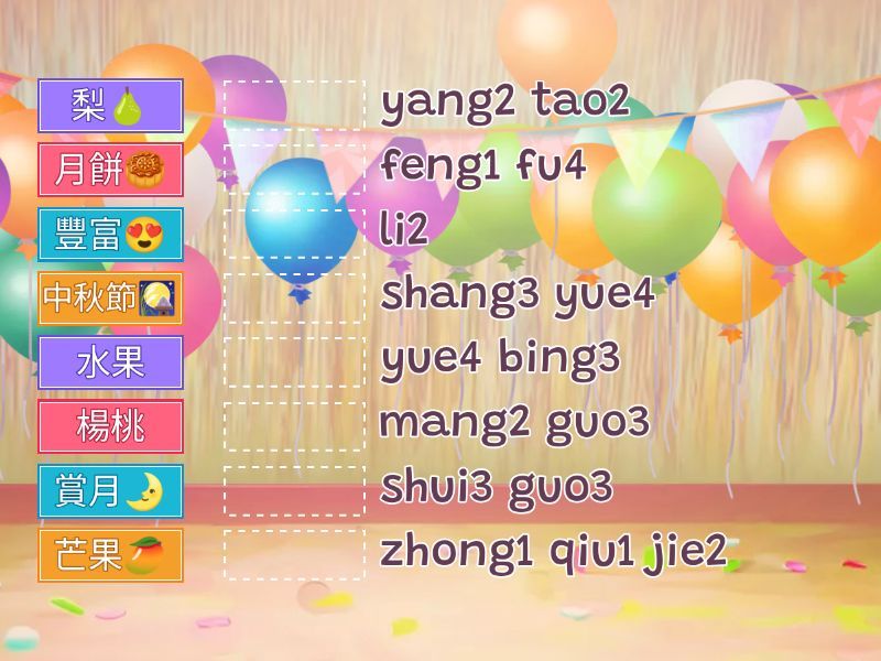 中秋節🎑 - zhong1 qiu1 jie2, 月餅🥮 - yue4 bing3, 賞月🌛 - shang3 yue4, 水果 - shui3 guo3, 梨🍐 - li2 , 楊桃 - yang2 tao2, 芒果🥭 - mang2 guo3, 豐富😍 - feng1 fu4,
