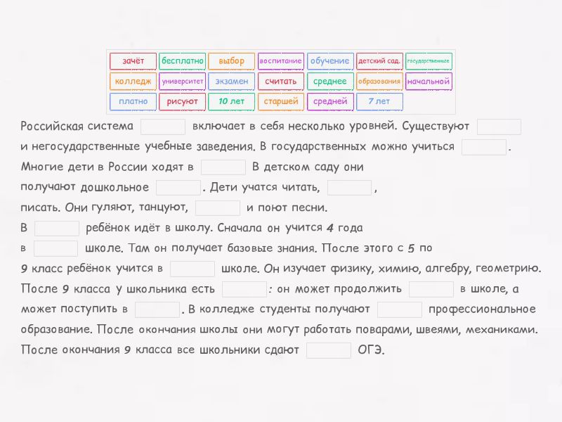 Российская система ____ включает в себя несколько уровней. Существуют ____ и негосударственные учебные заведения. В государственных можно учиться ____. Многие дети в России ходят в ____ В детском саду они получают дошкольное ____. Дети учатся читать, ____, писать. Они гуляют, танцуют, ____ и поют песни. В ____ ребёнок идёт в школу. Сначала он учится 4 года в ____ школе. Там он получает базовые знания. После этого с 5 по 9 класс ребёнок учится в ____ школе. Он изучает физику, химию, алгебру, геометрию. После 9 класса у школьника есть ____: он может продолжить ____ в школе, а может поступить в ____. В колледже студенты получают ____ профессиональное образование. После окончания школы они могут работать поварами, швеями, механиками. После окончания 9 класса все школьники сдают ____ ОГЭ. В ____ школе ученики могут выбрать ____, которые будут изучать более интенсивно. В конце 11 класса школьники сдают ____. Все ученики ____ экзамен по русскому языку и математике, а также выбирают те экзамены, которые им нужны для ____ в университет. Например, если вы хотите стать врачом, вы будете сдавать ____ и биологию, если вы хотите стать программистом, то вы будете сдавать ____, а если историком - ____ и обществознание. В университете есть возможность учиться ____, но для этого нужно получить высокие ____ на экзамене ЕГЭ. В университете студенты получают ____. Существуют три уровня образования: бакалавриат, ____, аспирантура.
