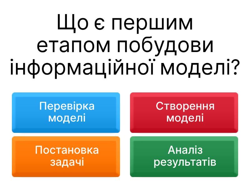 1) Що є першим етапом побудови інформаційної моделі? a) Перевірка моделі b) Створення моделі c) Постановка задачі d) Аналіз результатів 2) Що називають інформаційною моделлю? a) Точну копію об’єкта b) Спрощене подання об’єкта чи процесу c) Лише математичну формулу d) Малюнок будь-якого предмета 3) Що роблять на етапі виділення суттєвих властивостей? a) Перевіряють точність моделі b) Обирають головні характеристики об’єкта c) Видаляють непотрібні файли d) Змінюють вигляд моделі 4) Яка з наведених моделей є інформаційною? a) Муляж серця b) Глобус c) Таблиця даних d) Макет будинку 5) На якому етапі моделі застосовують для прогнозування подій? a) Створення b) Використання c) Перевірка d) Виділення параметрів 6) Який приклад НЕ є інформаційною моделлю? a) Формула b) Карта c) Таблиця d) Вирізаний з дерева макет міста 7) Інформаційна модель може бути подана у вигляді: a) Лише тексту b) Лише чисел c) Тексту, таблиці, схеми або формули d) Тільки зображення