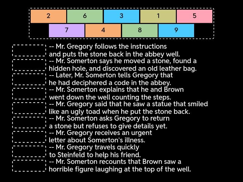1 - -- Mr. Gregory receives an urgent letter about Somerton’s illness., 2 - -- Mr. Gregory travels quickly to Steinfeld to help his friend., 3 - -- Mr. Somerton asks Gregory to return a stone but refuses to give details yet., 4 - -- Mr. Gregory follows the instructions and puts the stone back in the abbey well., 5 - -- Later, Mr. Somerton tells Gregory that he had deciphered a code in the abbey., 6 - -- Mr. Somerton explains that he and Brown went down the well counting the steps., 7 - -- Mr. Somerton says he moved a stone, found a hidden hole, and discovered an old leather bag., 8 - -- Mr. Somerton recounts that Brown saw a horrible figure laughing at the top of the well., 9 - -- Mr. Gregory said that he saw a statue that smiled like an ugly toad when he put the stone back.,