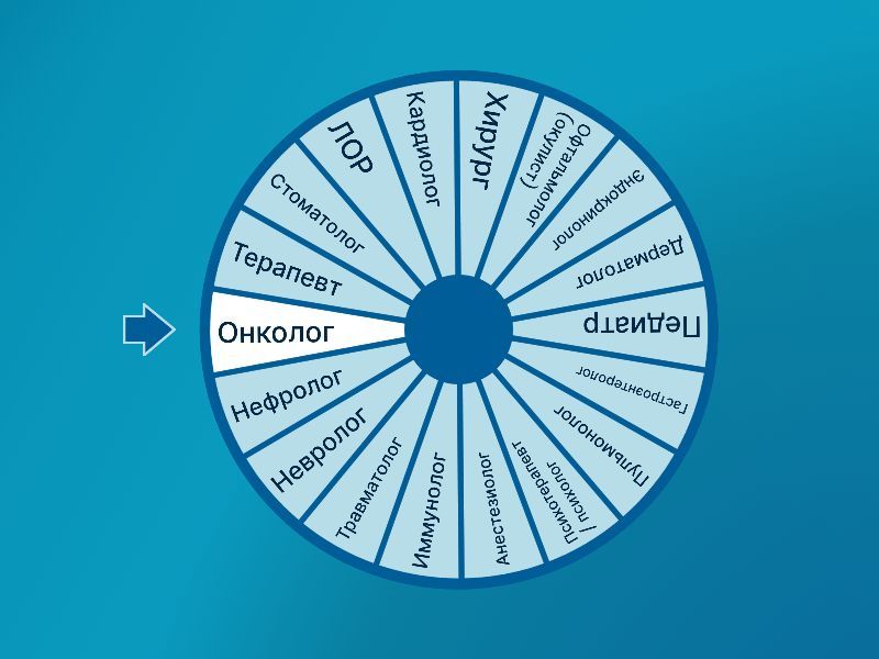 1) Терапевт 2) Стоматолог 3) ЛОР 4) Кардиолог 5) Хирург 6) Офтальмолог (окулист) 7) Эндокринолог 8) Дерматолог 9) Педиатр 10) Гастроэнтеролог 11) Пульмонолог 12) Психотерапевт / психолог 13) Анестезиолог 14) Иммунолог 15) Травматолог 16) Невролог 17) Нефролог 18) Онколог