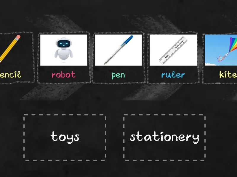 toys: yo-yo, doll, car, robot, ball, kite, stationery: book, eraser, marker, pen, pencil, ruler,