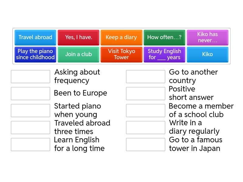 Travel abroad - Go to another country, Try sushi - Eat sushi for the first time, Learn guitar - Study guitar, Keep a diary - Write in a diary regularly, Visit Tokyo Tower - Go to a famous tower in Japan, Study English for ___ years - Learn English for a long time, Have a pet - Own an animal, Play the piano since childhood - Started piano when young, Work part-time - Have a small job after school, Join a club - Become a member of a school club, How often…? - Asking about frequency, How long…? - Asking about duration, I’ve studied for five years. - Duration answer, I’ve tried sushi many times. - Experience answer, Yes, I have. - Positive short answer, No, I haven’t. - Negative short answer, Momo - Played the drums for two years, Kiko - Traveled abroad three times, Kiko has never… - Been to Europe, Hana - Written in her diary since fourth grade,