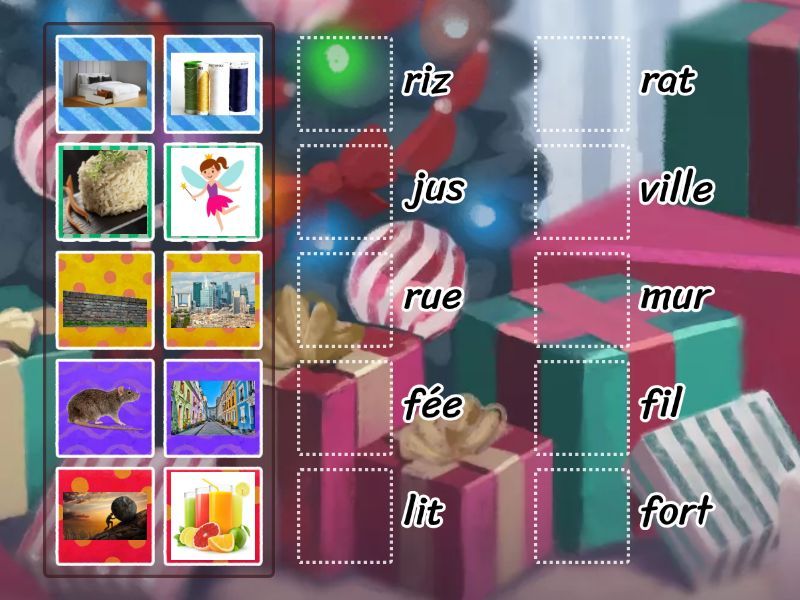 rue, rat, mur, lit, riz, - fée, - jus, - fil, fort, ville,