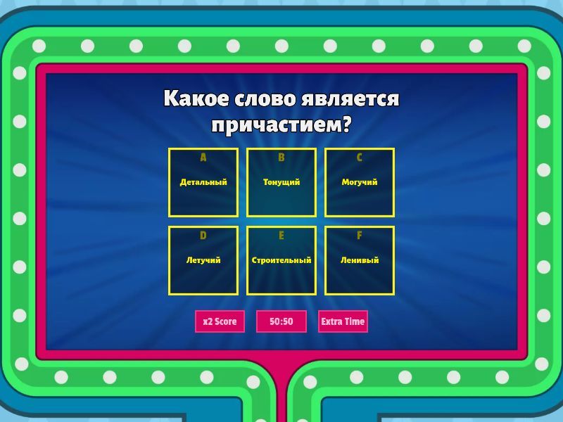 1) Какое слово является причастием? a) Детальный b) Тонущий c) Могучий d) Летучий e) Строительный f) Ленивый 2) Какое слово является прилагательным? a) Спящий b) Накрытый c) Горючий d) Подстреленный e) Выпитый f) Спиленный 3) Укажите причастие совершенного вида a) Вертевший b) Помогавшая c) Влиявший d) Созревшая e) Купающийся f) Лечащий 4) Укажите причастие несовершенного вида a) Полетевший b) Пострадавшая c) Слившийся d) Исследуемый e) Открытый f) Срубленный 5) В каком словосочетании причастие является зависимым словом ? a) Собравший урожай b) Убежавшее молоко c) Заглянувший в окно d) Читающий текст e) Стелющийся легко f) Гонимый ветром 6) В каком словосочетании причастие является главным словом ? a) Испеченные мамой b) Брошенное весло c) Слетевший лист d) Встроенный шкаф e) Выстиранное бельё f) Остывший чай 7) Укажите действительное причастие: a) Накалённых крыш b) Отделяющего меня c) В раскрытое окно d) Усеянная выступами e) Разбросанный по скату холма f) Раздвигаемые руками 8) Укажите страдательное причастие: a) светящийся полумрак b) ведущем с внутреннего двора c) Растущий у воды d) раздвигаемые руками e) на отражавшую огонь воду. f) тающая во рту земляника 9) Укажите действительное причастие настоящего времени a) Говоривший вслух b) Отвечающий на вопрос c) Уважаемый всеми d) Отмеченный на карте e) Накрытый стол f) Увенчанная рогами 10) Укажите страдательное причастие настоящего времени a) Вырастивший цветок b) Продуманный ответ c) По замёрзшей реке d) Гонимый ветром e) Приезжающий в гости f) Лечащий врач 11) Укажите действительное причастие прошедшего времени a) Незабываемая встреча b) В заброшенном саду c) Освещённая луной d) Выросший в тени e) Читаемый всеми f) Давно забытый 12) Укажите страдательное причастие прошедшего времени a) Заснувшие цветы b) В синеющем небе c) В цветущем саду d) Отлитый из меди e) Плывший по небу f) Опавшие с тополя