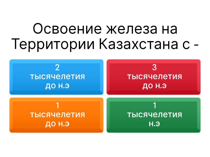1) Освоение железа на Территории Казахстана с - a) 2 тысячелетия до н.э b) 3 тысячелетия до н.э c) 1 тысячелетия до н.э d) 1 тысячелетия н.э 2) Бронза это смесь каких металлов a) Медь и олово b) железо и олово c) Медь и железо d) бронза приходит в чистом виде 3) Кочевое скотоводство возникло? a) В конце3 тысячелетия - начале2 тысячел b) В конце4 тысячелетия - начале3 тысячел c) В конце4 тысячелетия - начале2 тысячел d) В конце2 тысячелетия - начале1 тысячел 4) Добыча подножного корма из-под снега это? a) Качевка b) Тебеневка c) Зимник d) Летник 5) В кочевом скотоводстве использовались такие животные как? a) Верблюды, козы, лошади. b) Верблюды, овцы, коровы. c) Верблюды, овцы, лошади. d) Овцы, лошади. 6) Летнее пастбища кочевников? a) Қыстау b) Күзеу c) Жайлау d) Көктеу 7) Купол юрты a) Кереге b) Уык c) Канат d) Шанырак 8) Кара шанырак это? a) Чужой дом b) Соседский дом c) Родной дом d) Канат