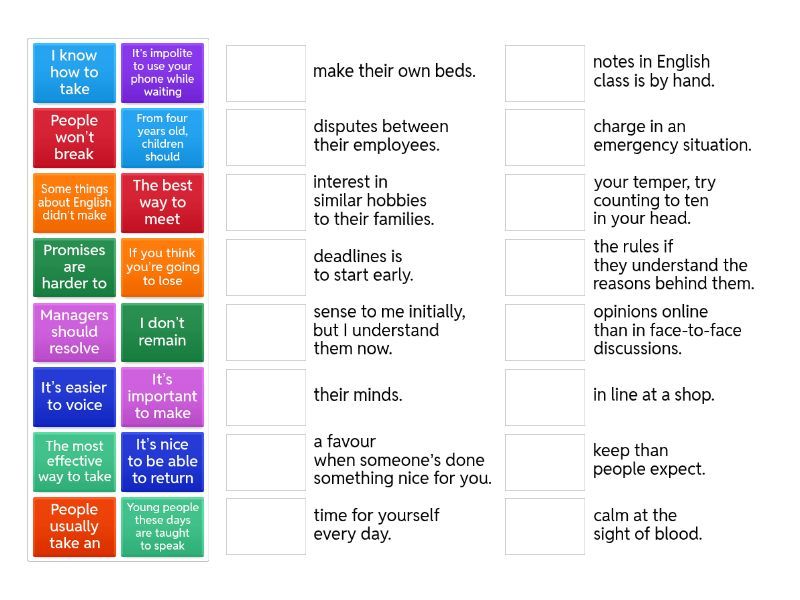 Managers should resolve - disputes between their employees., The best way to meet - deadlines is to start early., It’s important to make - time for yourself every day., It’s impolite to use your phone while waiting - in line at a shop., If you think you’re going to lose - your temper, try counting to ten in your head., From four years old, children should - make their own beds., People won’t break - the rules if they understand the reasons behind them., It’s easier to voice - opinions online than in face-to-face discussions., I know how to take - charge in an emergency situation., The most effective way to take - notes in English class is by hand., I don’t remain - calm at the sight of blood., People usually take an - interest in similar hobbies to their families., Some things about English didn’t make - sense to me initially, but I understand them now., It’s nice to be able to return - a favour when someone’s done something nice for you., Young people these days are taught to speak - their minds., Promises are harder to - keep than people expect.,