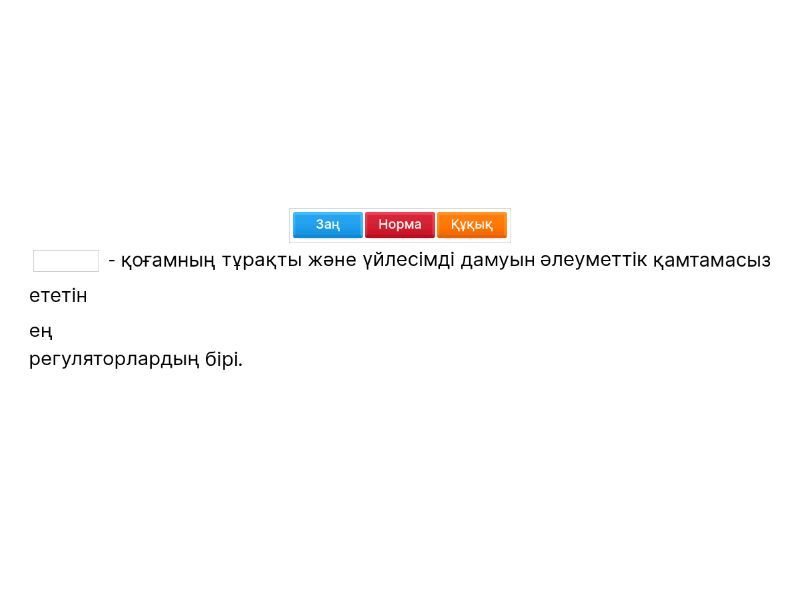 ____ - қоғамның тұрақты және үйлесімді дамуын әлеуметтік қамтамасыз ететін ең регуляторлардың бірі. Құқық нормасы - мемлекеттік билікпен танылатын, жалпыға міндетті, формальды түрде белгіленген, қоғамдық қатынастарды реттеуге бағытталған мінез-құлық ____ Жалпыға міндеттілік – белгілі бір әлеуметтік топқа емес, құқық ____ барлығына қолданылады. ____ - заңда, нормативтік құқықтық актілерде нақты мәтінмен бекітіледі. Мемлекеттік мәжбүрлеу – ____ саяси билігінің көрінісі.