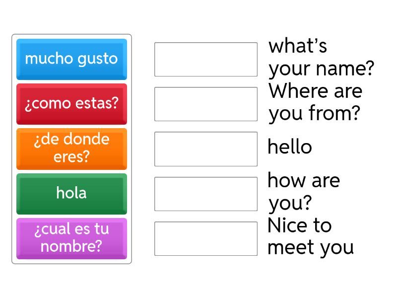 hola - hello, ¿como estas? - how are you?, ¿cual es tu nombre? - what’s your name?, mucho gusto - Nice to meet you, ¿de donde eres? - Where are you from?,