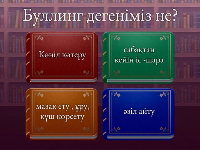 1) Буллинг дегеніміз не? a) Көңіл көтеру b) сабақтан кейін іс -шара c) мазақ ету , ұру, күш көрсету d) әзіл айту 2) Буллигтің неше түрлері бар a) физикалық b) барлық дұрыс емес c) физикалық , кибербуллинг, әлеуметтік, 3) Егер біреу саған онлайн түрінде жаман сөздер бұл қандай буллинг жатады a) әлеуметтік b) кибербуллинг c) психологиялық d) буллинг