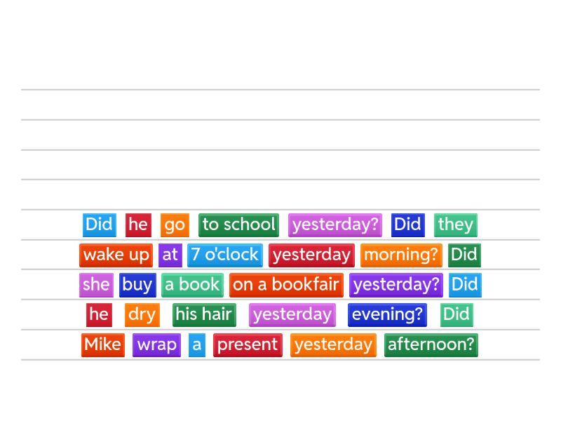 Did , he, go , to school, yesterday?, Did , they, wake up, at, 7 o'clock, yesterday, morning?, Did, she , buy, a book , on a bookfair, yesterday?, Did , he , dry, his hair, yesterday, evening?, Did, Mike , wrap , a, present, yesterday, afternoon?.