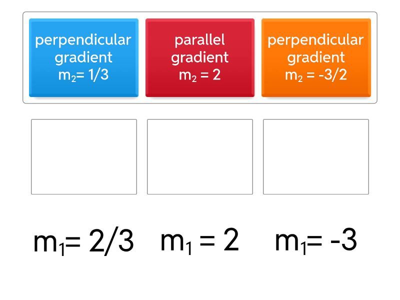 parallel gradient m2 = 2 - m1 = 2, perpendicular gradient m2 = -3/2 - m1= 2/3, perpendicular gradient m2= 1/3 - m1= -3,
