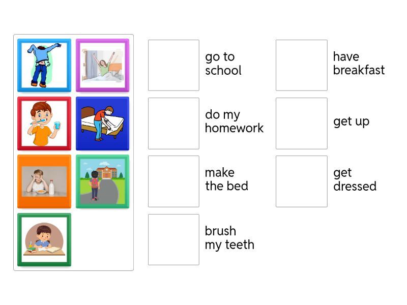 make the bed, get up, get dressed, have breakfast, go to school, brush my teeth, do my homework,